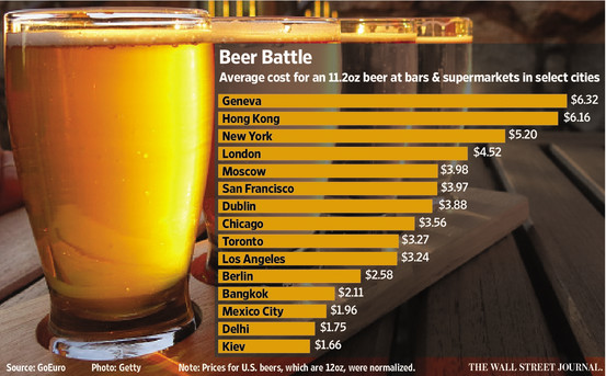 Недешево обойдется пиво и в Нью-Йорке, который оказался в списке на третьем месте после Женевы, — здесь оно стоит $5,20 ($8,97 в барах и $1,44 в магазинах), даже дороже, чем в Сан-Франциско, где стоимость напитка составляет $3,97.